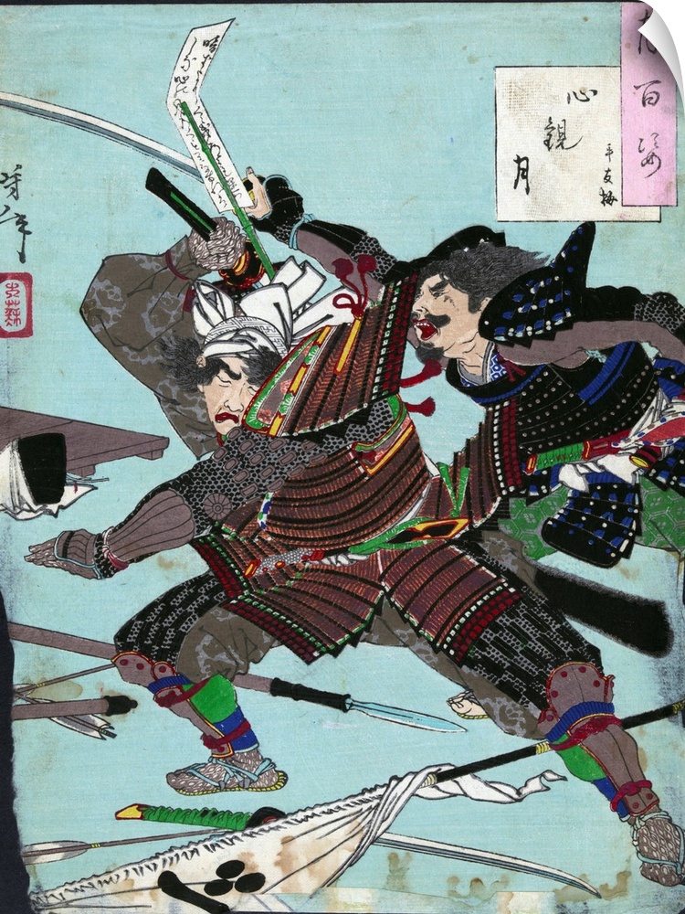 <p>Moon viewed through the heart by Yoshitoshi Taiso. Woodcut colour print shows two samurai warriors fighting among fallen weapons.</p>