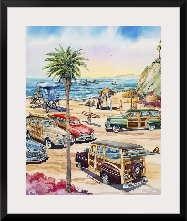 <p>Contemporary watercolor painting of several woodie wagons parked on the beach at Wavecrest in Encinitas, the larges woodie show in the US.</p>