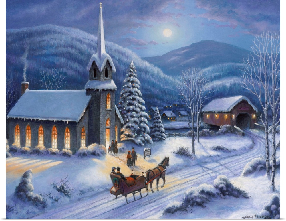 <p>Snow, church, moon, covered bridge, horse and sledChristmas, winter</p>