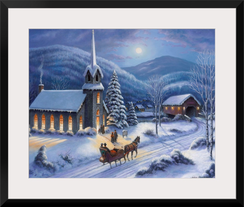 <p>Snow, church, moon, covered bridge, horse and sledChristmas, winter</p>