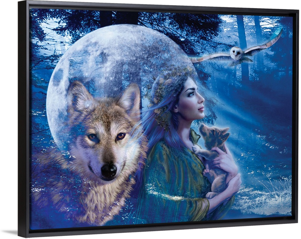 <p>Giant, landscape, Native American artwork of the profile of a woman with long hair, holding a wolf cub as she looks off into the distance and an owl flies overhead. Beside her is an adult wolfs face, they are both in front of a large moon that covers a majority of the woodland scene in the background.</p>