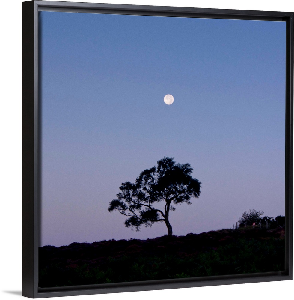 <p>A lone tree with a full moon rising with a deep purple blue pink dusk cloudless sky.</p>