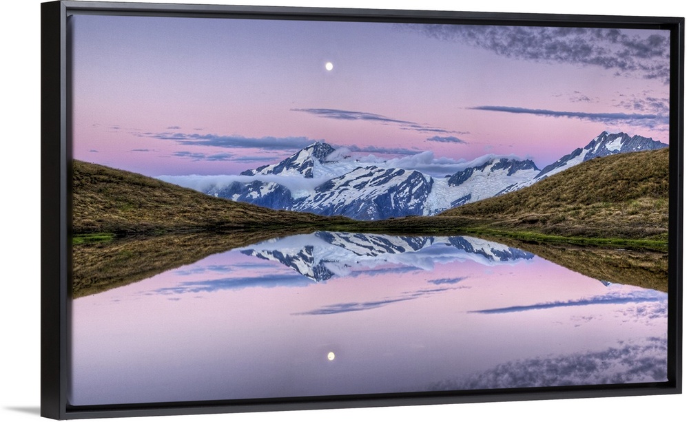 <p>Mount Aspiring, moonrise at dusk over Cascade Saddle, Mount Aspiring National Park, New Zealand</p>