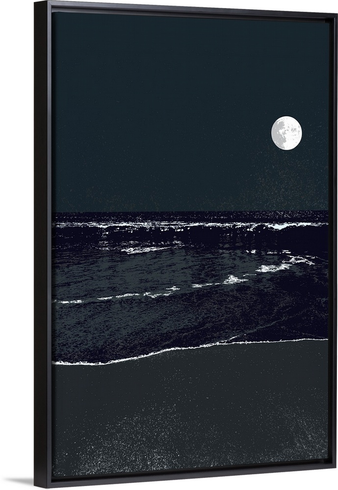 <p>A high contrast graphic image of a nighttime full moonrise over a calm ocean.</p>