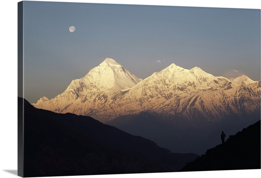 <p>Moonset at sunrise over the Himalayan peaks of Dhaulagiri and Tukuche, Nepal, Nepal</p>