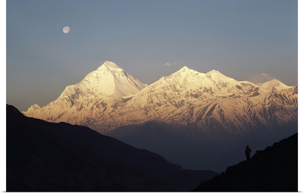 <p>Moonset at sunrise over the Himalayan peaks of Dhaulagiri and Tukuche, Nepal, Nepal</p>