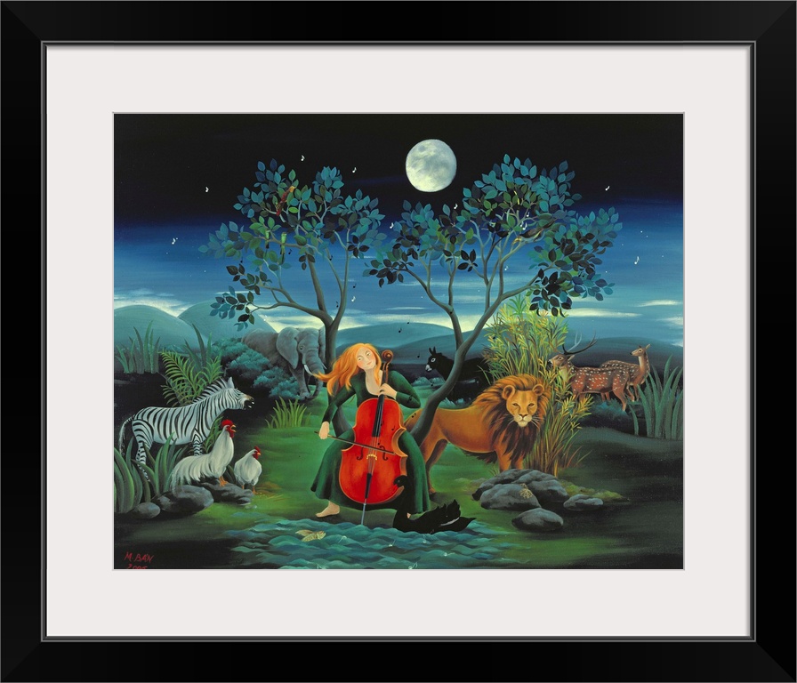 <p>Contemporary painting of a woman playing music with wild animals at night.</p>