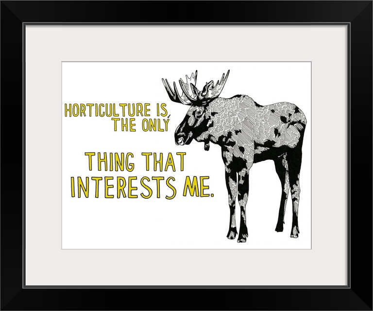 <p>Black and white illustration of a moose with the phrase "Horticulture is the Only Thing That Interests Me" handwritten in yellow on the side.</p>