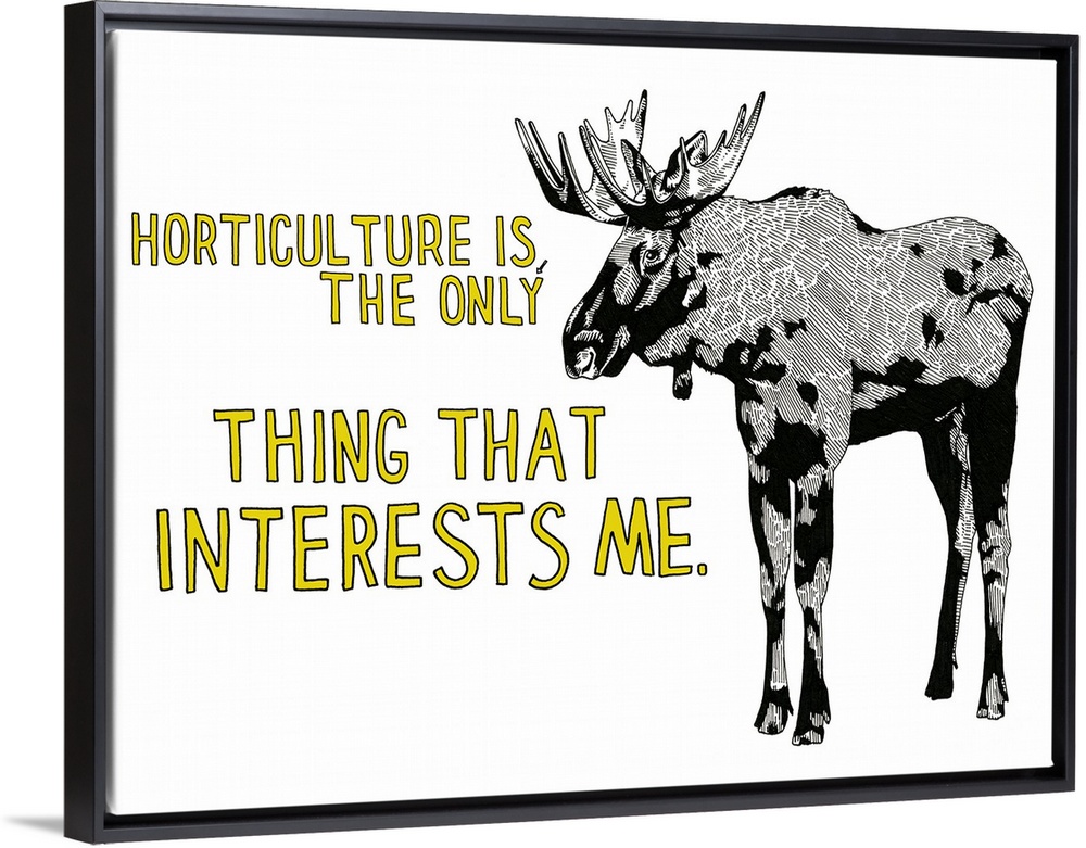 <p>Black and white illustration of a moose with the phrase "Horticulture is the Only Thing That Interests Me" handwritten in yellow on the side.</p>