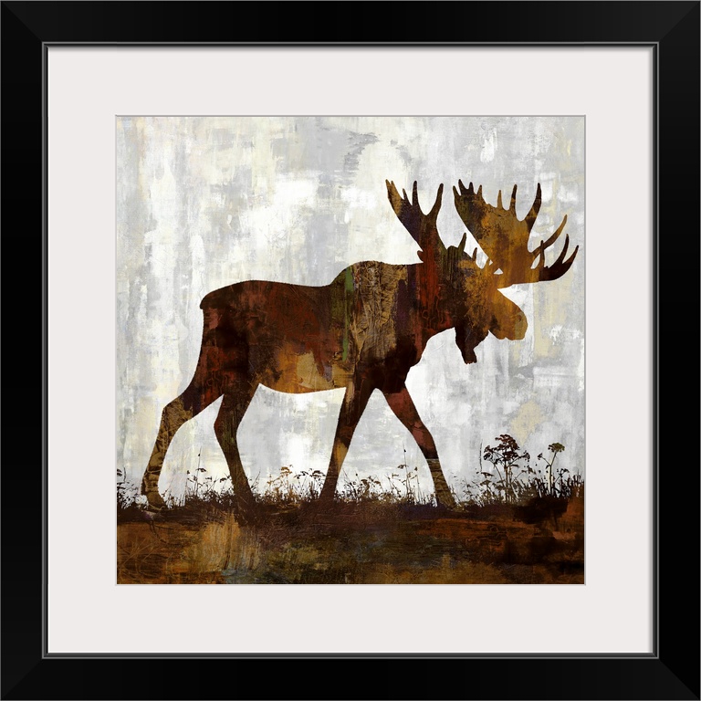 <p>Square decor with a brown and gold silhouette of a moose on a gray, tan, and white background.</p>
