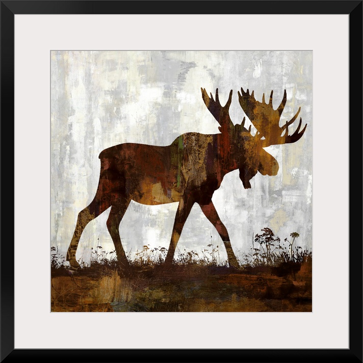 <p>Square decor with a brown and gold silhouette of a moose on a gray, tan, and white background.</p>