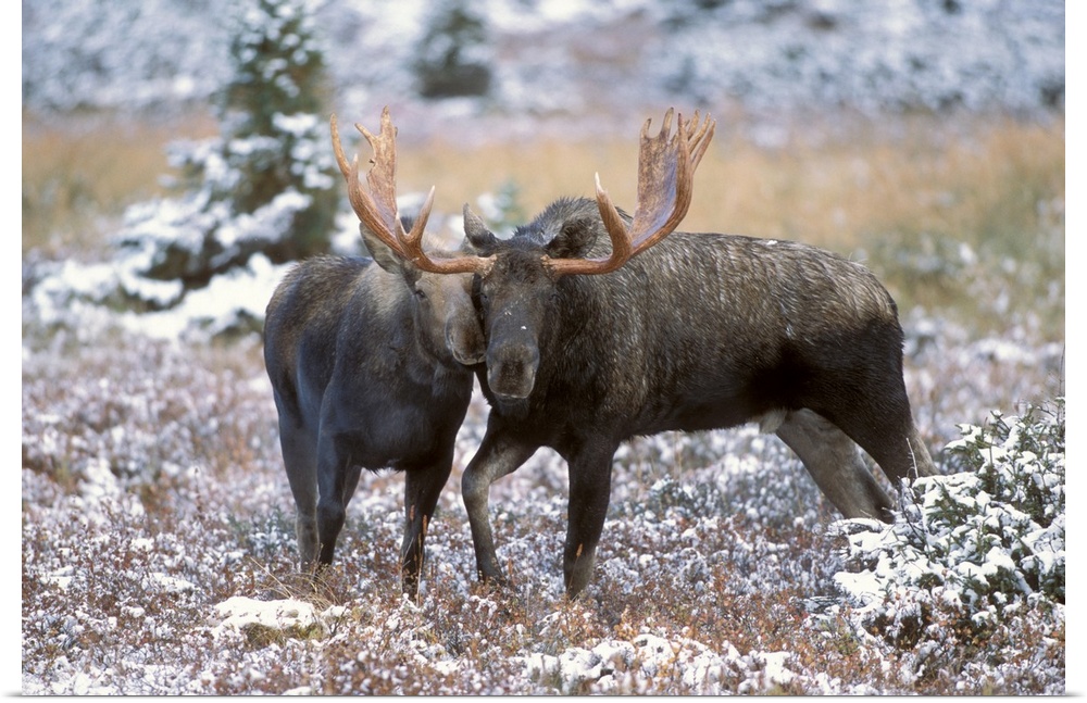 <p>Moose Bull And Cow Rubbing Muzzles In Courtship Behavior During Rut, Powerline Pass, Chugach State Park, Chugach Mountains, Alaska</p>