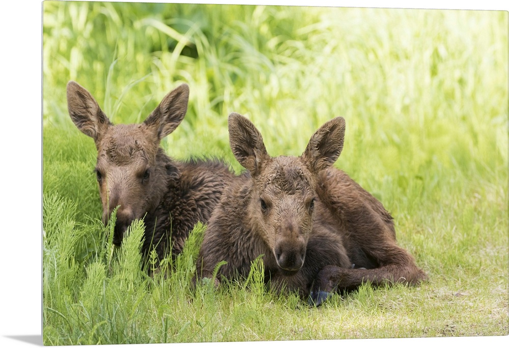 <p>Moose (alces alces) calves laying together while their mother feeds nearby, south-central Alaska. Anchorage, Alaska, united states of America.</p>