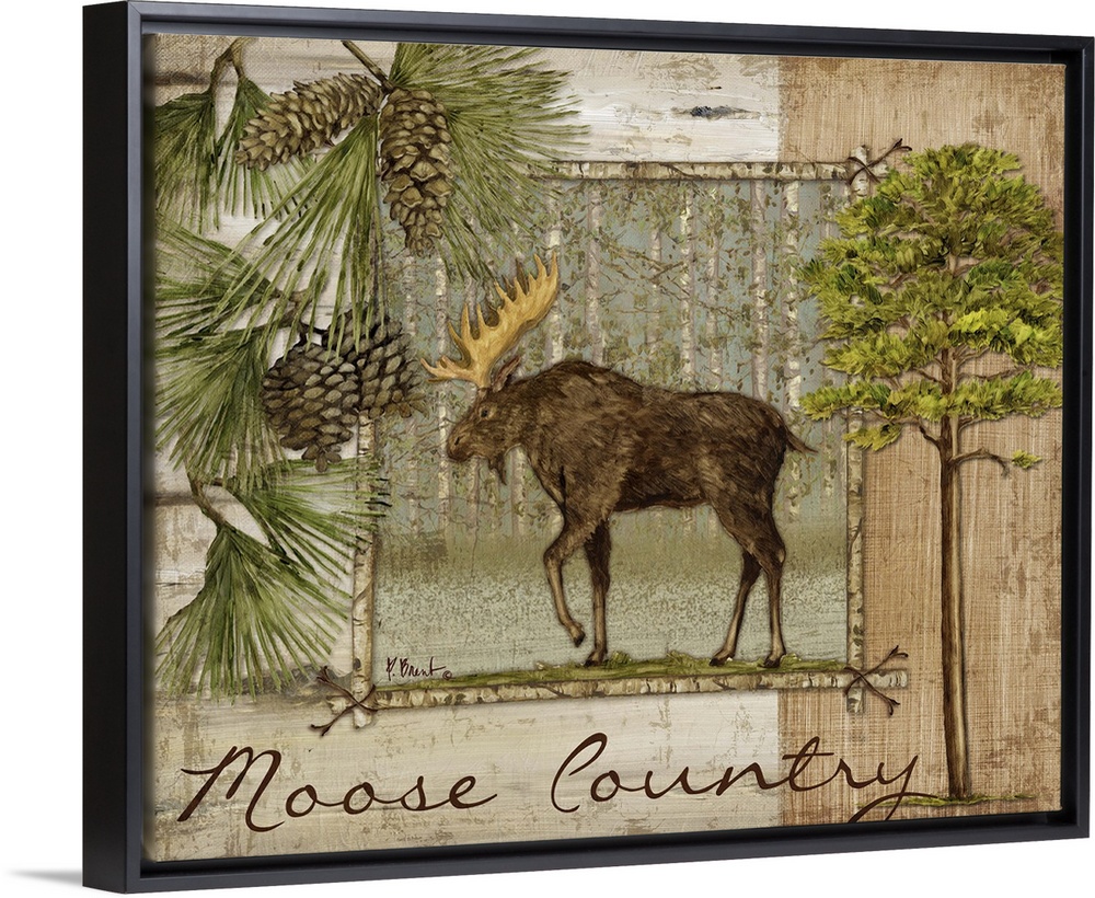 <p>Decorative artwork of a moose in a frame, with pine needles and pinecones, trees, and the words Moose Country.</p>