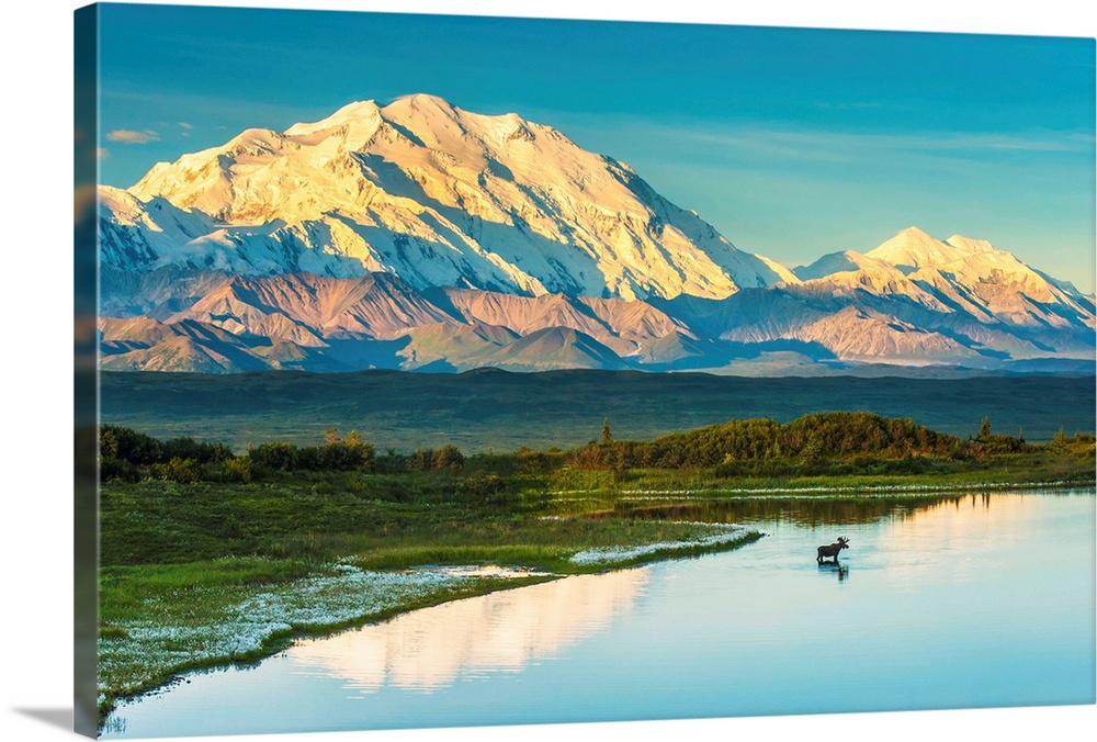 <p>A silhouette of a bull moose feeding in a pond next to the Park Road in early morning light in Denali National Park with Mount McKinley and the Alaska Range in the background.</p>