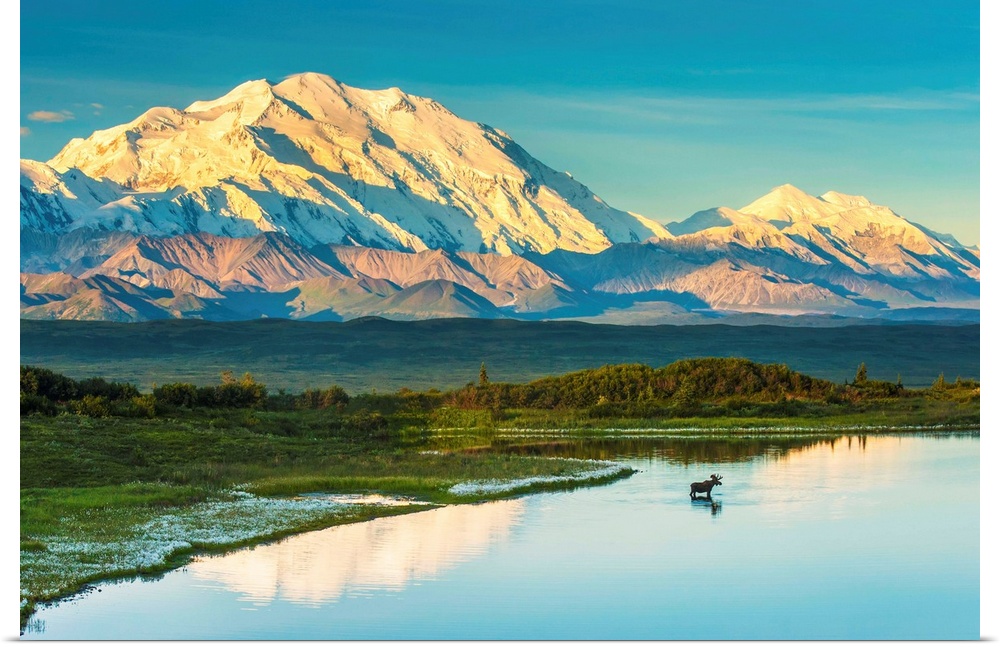 <p>A silhouette of a bull moose feeding in a pond next to the Park Road in early morning light in Denali National Park with Mount McKinley and the Alaska Range in the background.</p>