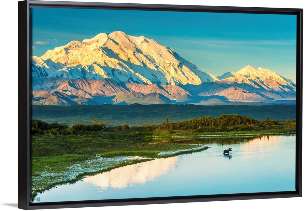 <p>A silhouette of a bull moose feeding in a pond next to the Park Road in early morning light in Denali National Park with Mount McKinley and the Alaska Range in the background.</p>