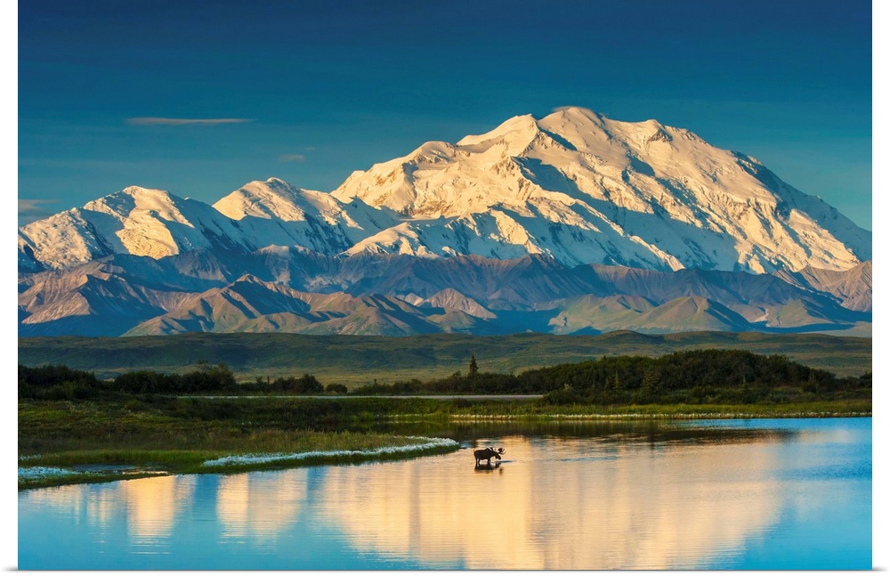 <p>A silhouette of a bull moose feeding in a pond next to the Park Road in early morning light in Denali National Park with Mount McKinley and the Alaska Range in the background.</p>