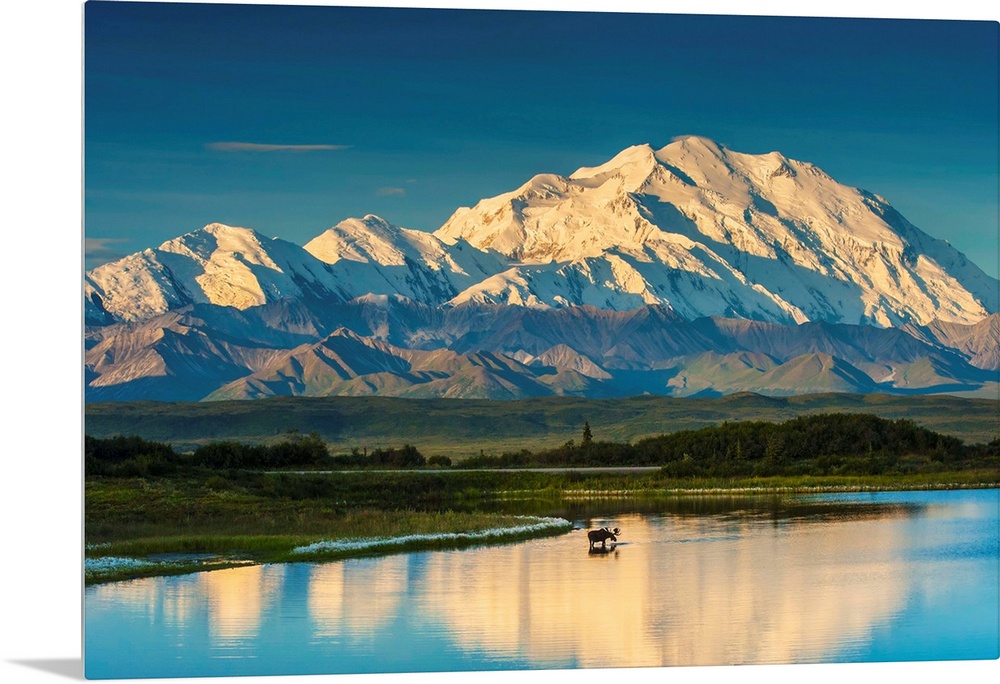 <p>A silhouette of a bull moose feeding in a pond next to the Park Road in early morning light in Denali National Park with Mount McKinley and the Alaska Range in the background.</p>