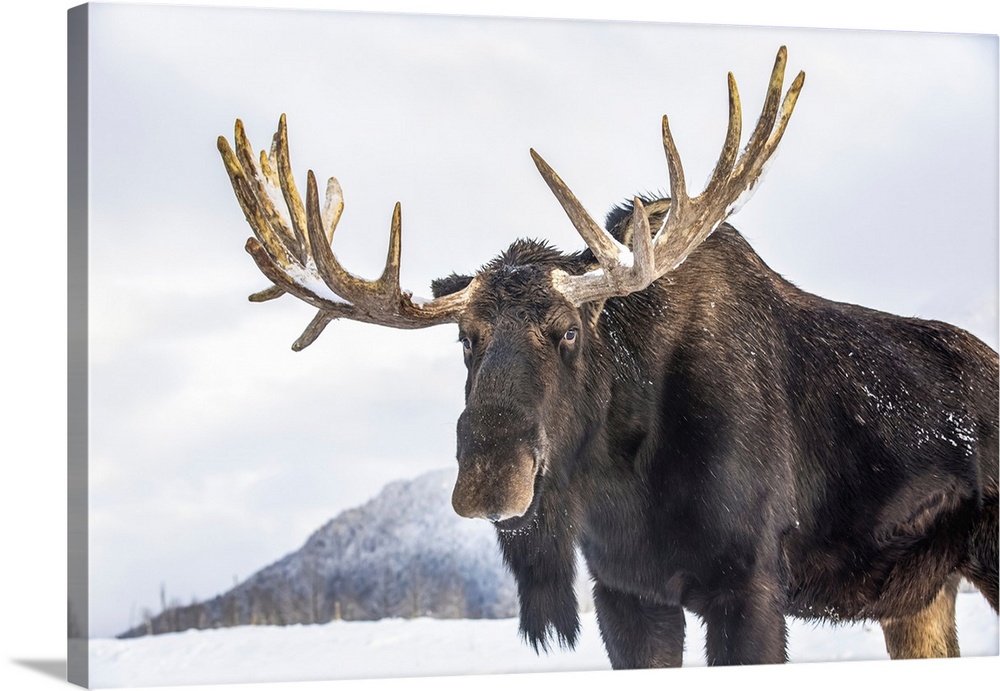 <p>Mature bull moose (alces alces) with antlers shed of velvet standing in snow, Alaska wildlife conservation center, south-central Alaska, portage, united states of America.</p>