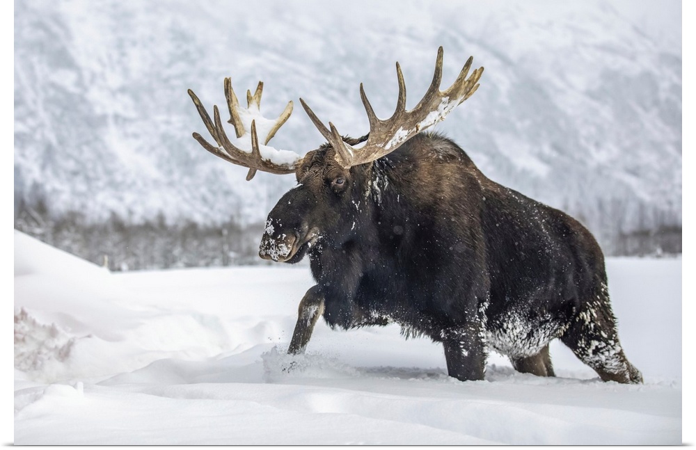 <p>Mature bull moose (alces alces) with antlers shed of velvet walking in snow, Alaska wildlife conservation center, south-central Alaska, united states of America.</p>
