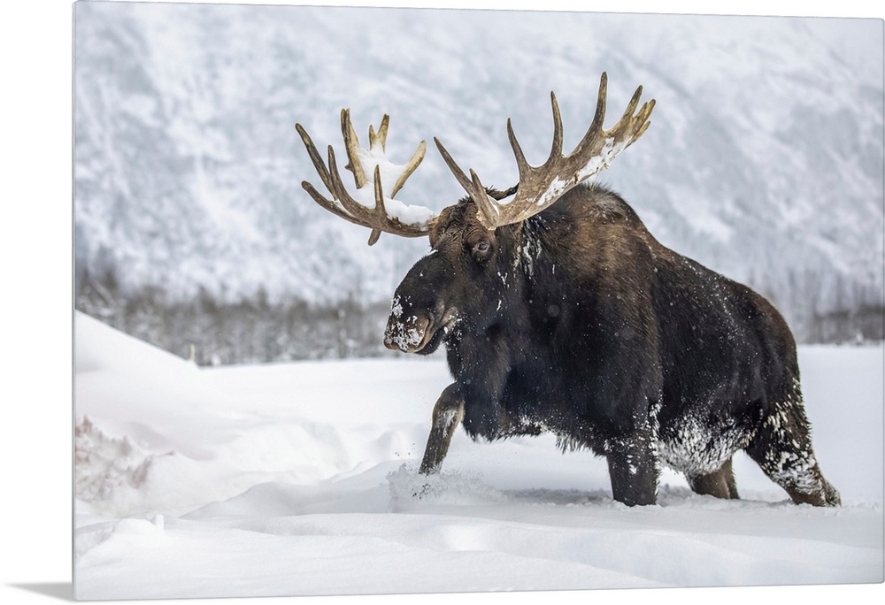 <p>Mature bull moose (alces alces) with antlers shed of velvet walking in snow, Alaska wildlife conservation center, south-central Alaska, united states of America.</p>