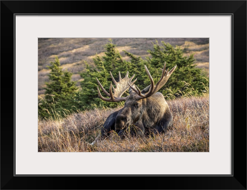 <p>A mature bull moose (alces alces) with matured antlers rests on a hillside in autumn in the powerline pass area of anchorage, south-central Alaska, united states of America.</p>