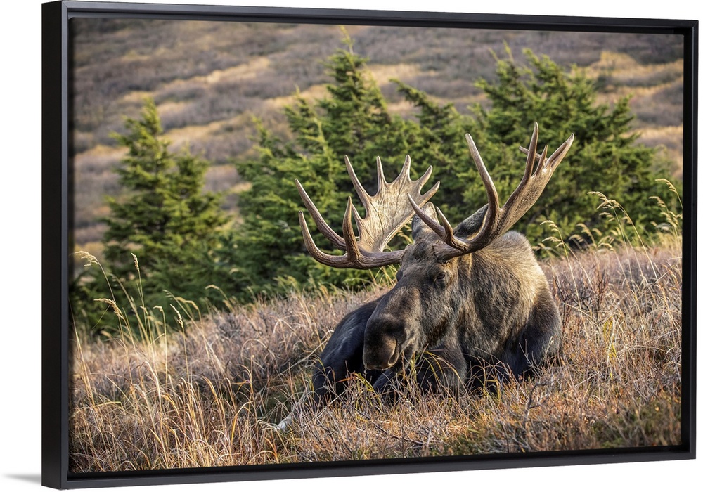 <p>A mature bull moose (alces alces) with matured antlers rests on a hillside in autumn in the powerline pass area of anchorage, south-central Alaska, united states of America.</p>