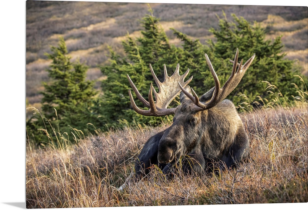 <p>A mature bull moose (alces alces) with matured antlers rests on a hillside in autumn in the powerline pass area of anchorage, south-central Alaska, united states of America.</p>