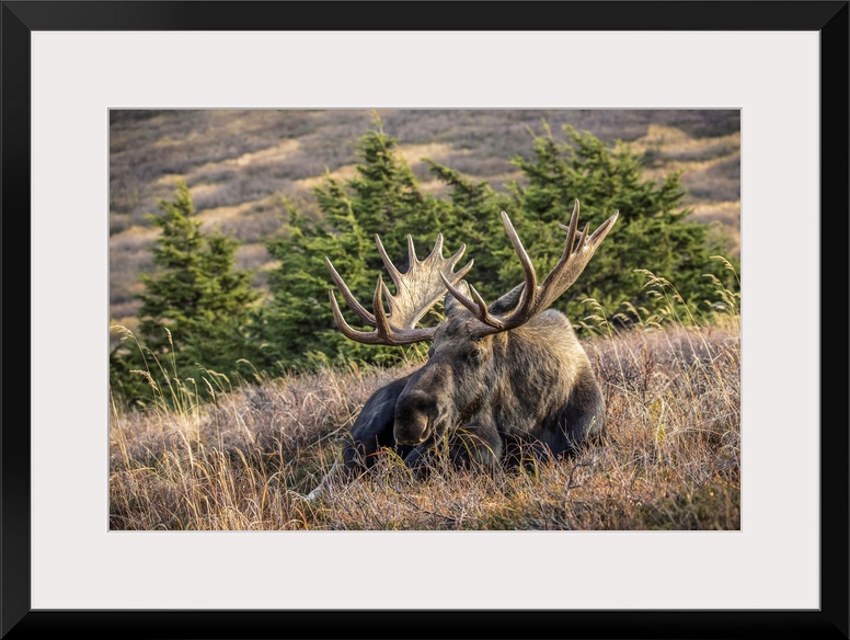 <p>A mature bull moose (alces alces) with matured antlers rests on a hillside in autumn in the powerline pass area of anchorage, south-central Alaska, united states of America.</p>