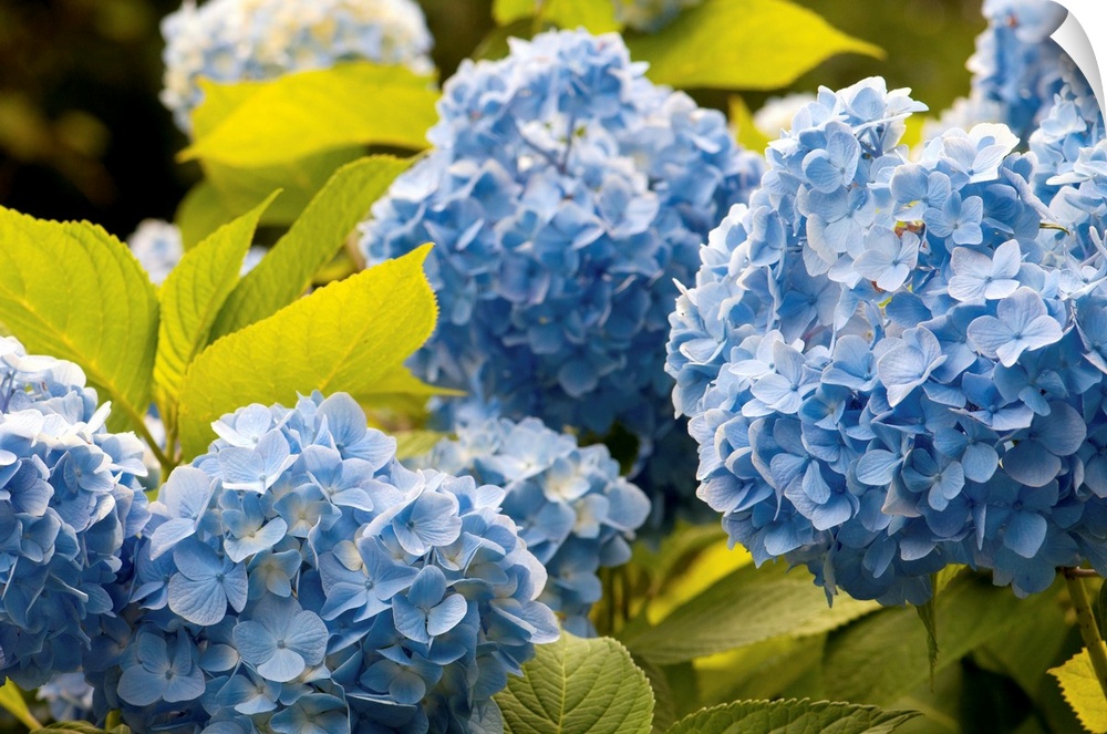 <p>Mophead hydrangea flowers and leaves, Hydrangea macrophylla.</p>