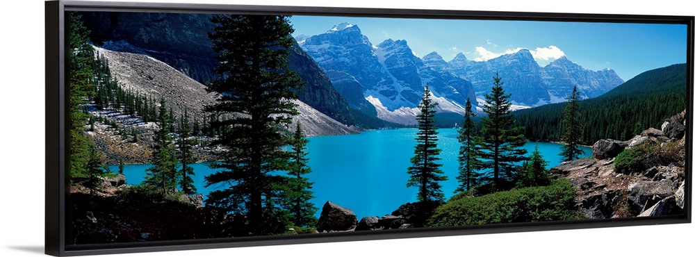 <p>Panoramic photograph shows a lake filled with sparkling water that is surrounded by dense forests of trees and snow filled mountains.</p>