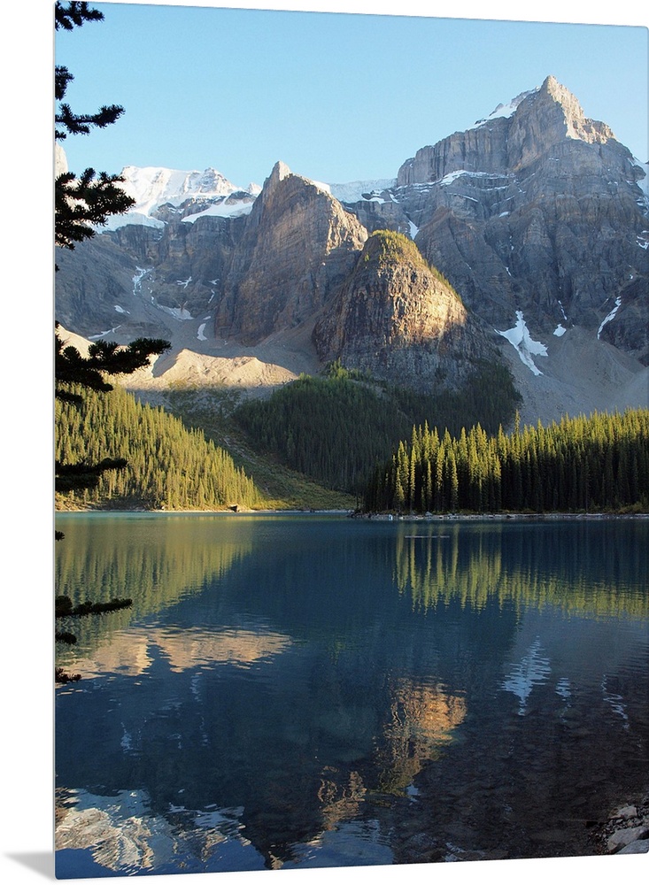 <p>Snow-covered mountains and forest with a blue sky, reflected in Moraine Lake, a glacier-fed lake in Banff National Park in the Canadian Rocky Mountains.</p>