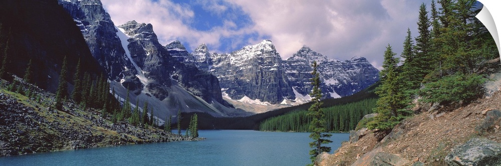<p>Canada, Alberta, Moraine Lake. Clouds hide the peaks of Moraine Lake in the Valley of the Ten Peaks in Banff NP, a World Heritage Site, Alberta, Canada.</p>