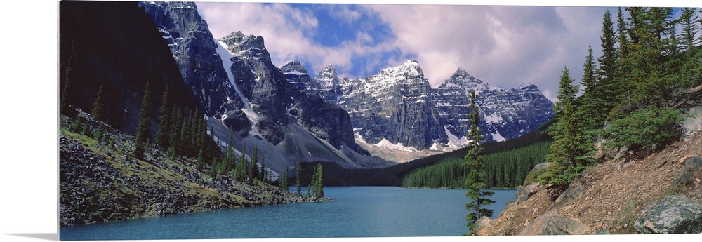 <p>Canada, Alberta, Moraine Lake. Clouds hide the peaks of Moraine Lake in the Valley of the Ten Peaks in Banff NP, a World Heritage Site, Alberta, Canada.</p>