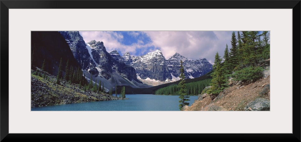 <p>Canada, Alberta, Moraine Lake. Clouds hide the peaks of Moraine Lake in the Valley of the Ten Peaks in Banff NP, a World Heritage Site, Alberta, Canada.</p>