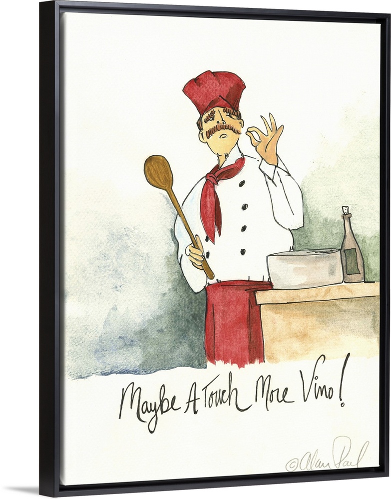 <p>Watercolor painting with pen and ink details of a chef seasoning a dish titled More Vino by Alan Paul.</p>