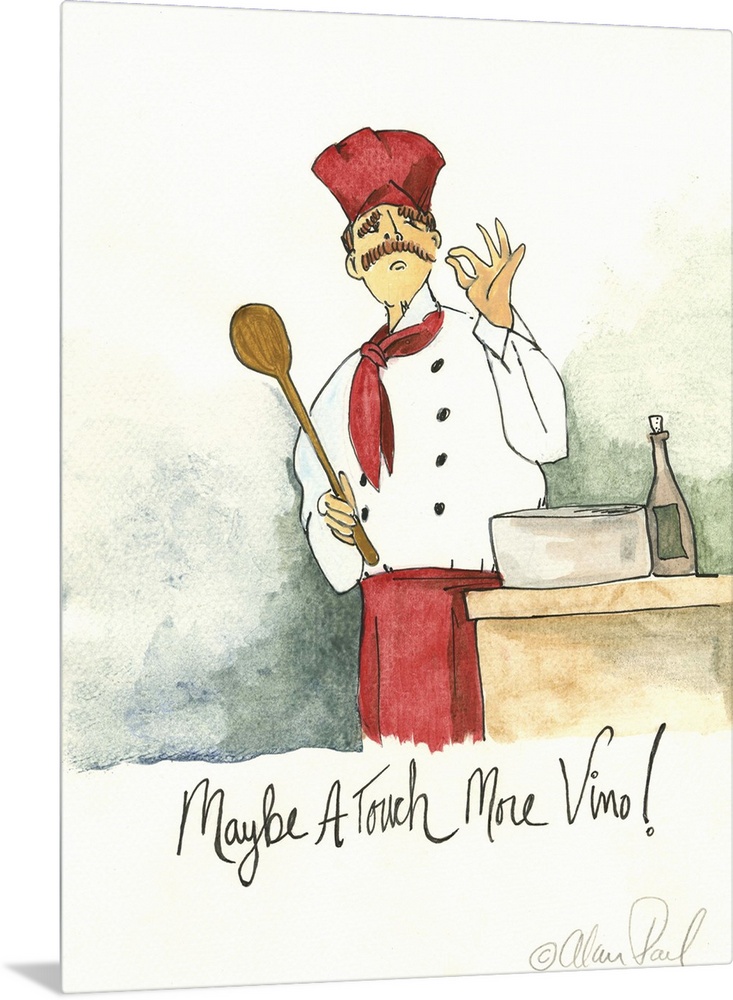 <p>Watercolor painting with pen and ink details of a chef seasoning a dish titled More Vino by Alan Paul.</p>