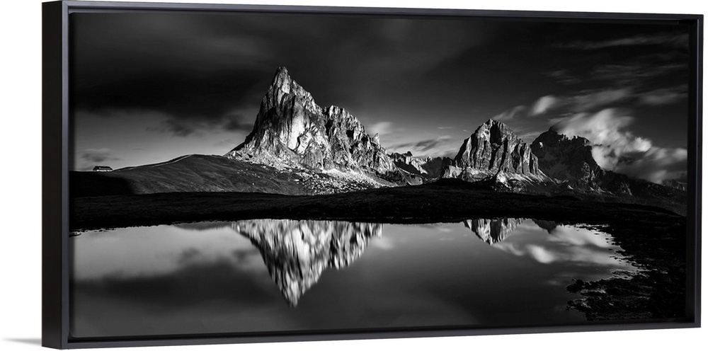 <p>Black and white panoramic landscape photograph of the Dolomites, Italy with reflections on the lake.</p>