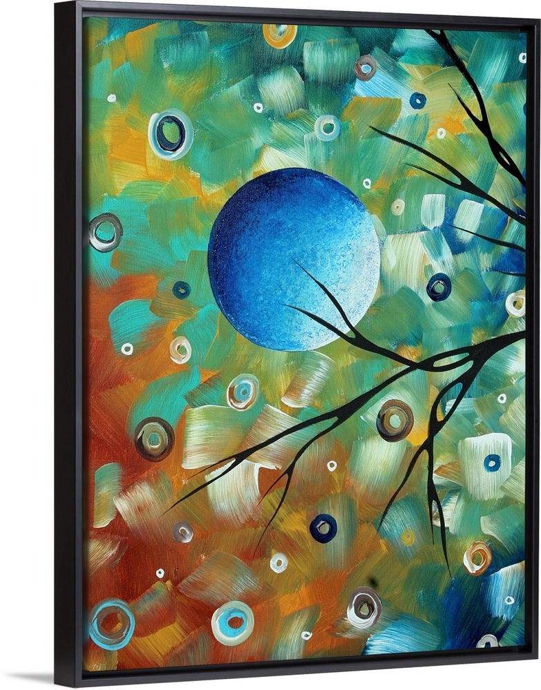 <p>Contemporary abstract image of the moon and tree branch silhouettes. The background is colorful, consisting of circles and short brush strokes of color.</p>