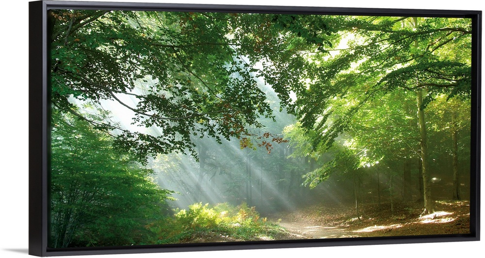 <p>A panoramic image of a trail through the forest with sun streaks peeping through the tree limbs.</p>