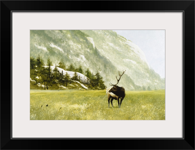<p>Contemporary painting of an elk standing in the middle of a snowy valley watching three black birds graze.</p>