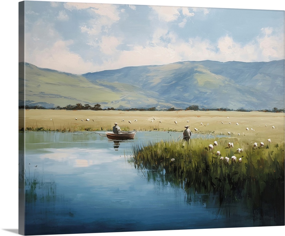 Art Blue Wall Art Contemporary Art Paula Freeman Landscapes Mountains River, Creek and Stream Painting Sports Fishing Transportation Boat