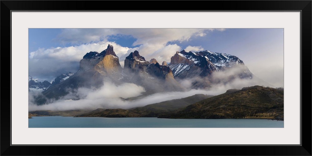 <p>Morning clouds over the peaks of the Cuernos del Paine and Lake Pehoe, Torres Del Paine National Park, Chile.</p>
