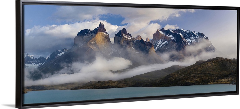 <p>Morning clouds over the peaks of the Cuernos del Paine and Lake Pehoe, Torres Del Paine National Park, Chile.</p>