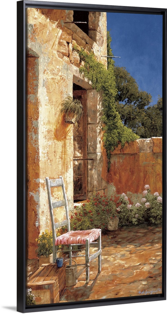 <p>Artwork of a chair outside a home in a European village.</p>