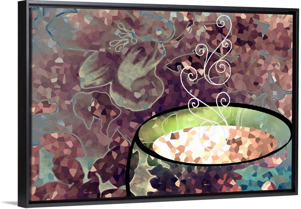 <p>Mosaic style artwork of steam rising from hot liquid in a cup.</p>