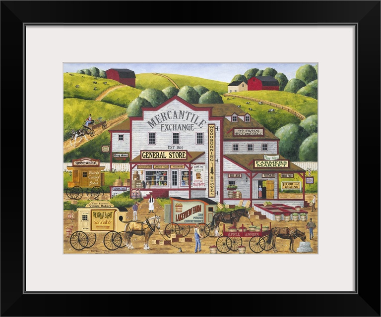 <p>Americana scene of horses and carts delivering goods to a General Store.</p>