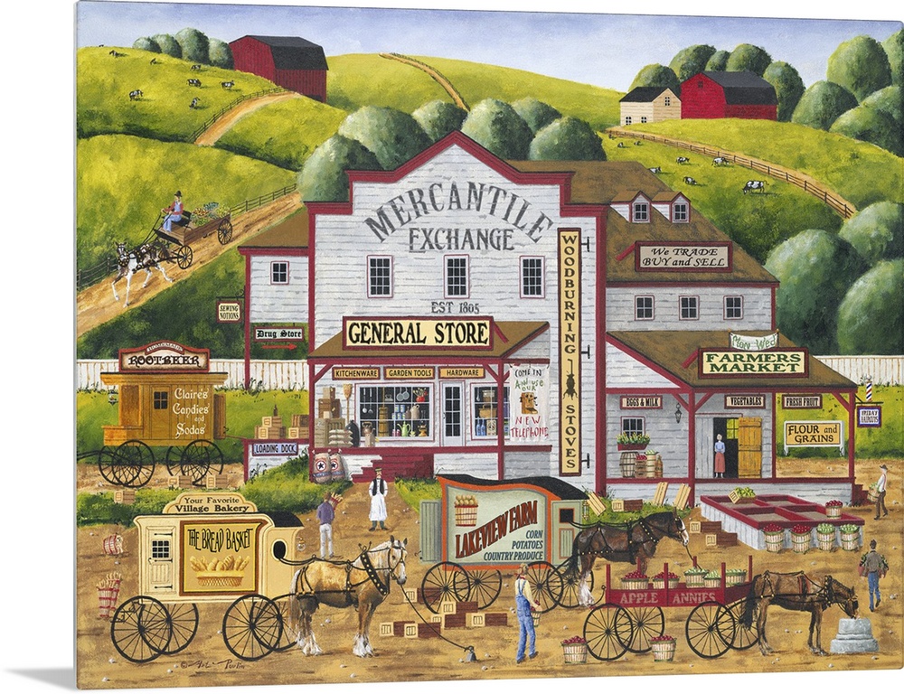 <p>Americana scene of horses and carts delivering goods to a General Store.</p>
