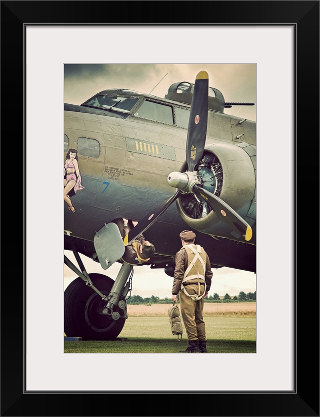 <p>Pilots climbing onboard a B-17G Flying Fortress bomber.</p>